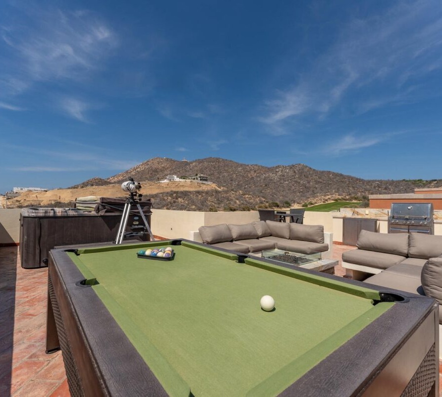 Walk upstairs to the rooftop terrace to enjoy amazing views, a large hot rub which seats 7 people, a fire pit and sofa, two lounge chairs, a billiard table and a second grill.