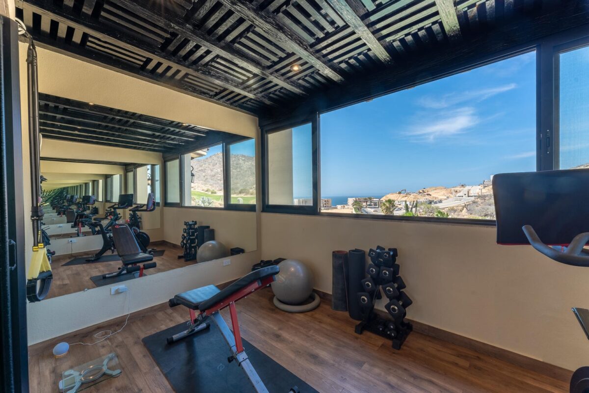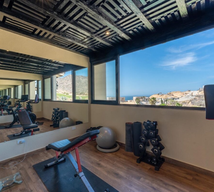 Upstairs you will find the workout area with a TRX system, a Peloton bike+ (you can bring your own shoes or we have cage adapters to wear with your sneakers). There are also Peloton weights (2 lbs, 3 lbs, 5 lbs, 10 lbs, 15 lbs, 20 lbs), a Peloton mat, Peloton resistance bands and Peloton Yoga strap and blocks. The exercise room offers an amazing view of the Pacific Ocean – perfect to watch for whales from November – March!