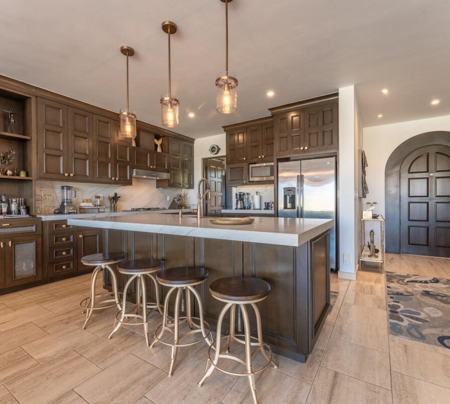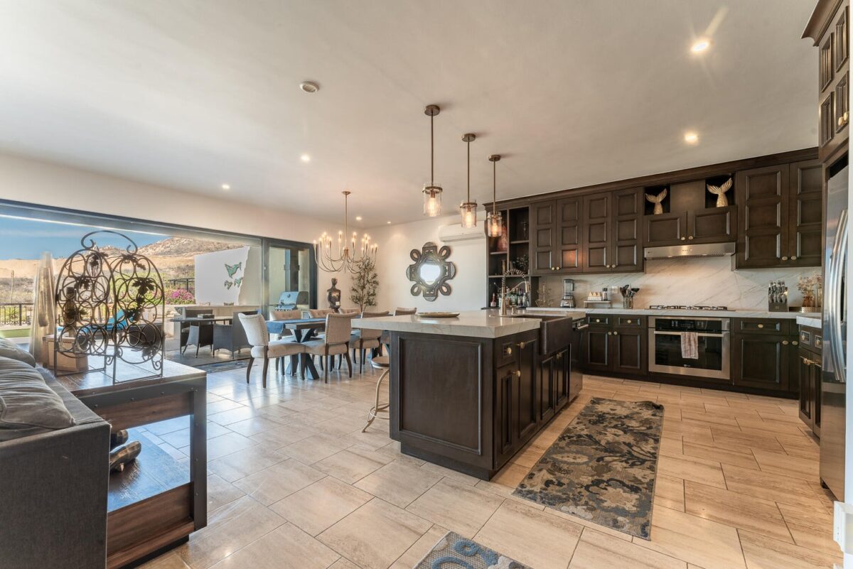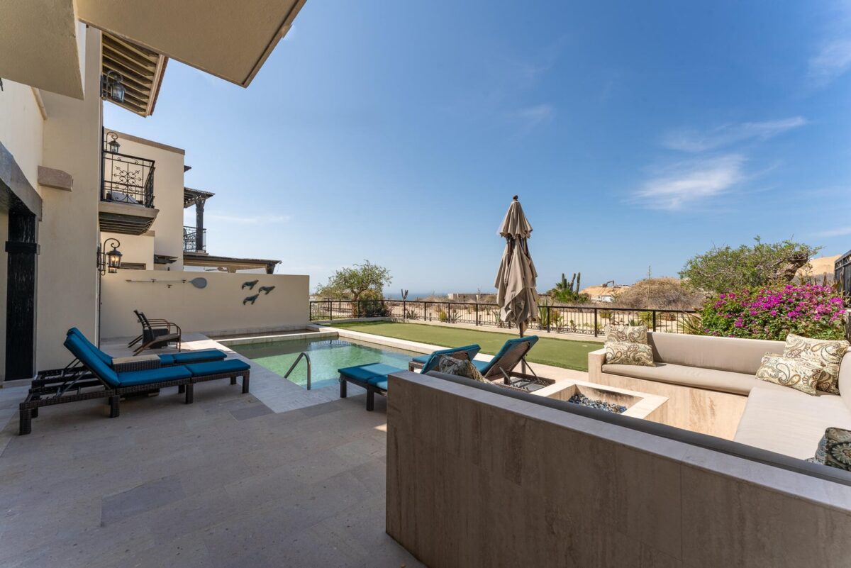 Step outside the sliding glass doors to your own outdoor oasis with views of the mountains and the Pacific Ocean. On the main terrace, you’ll find an amazing firepit with seating for 10, a putting green, a swimming pool, an over-sized hot tub, 4 lounge chairs, a dining area with a grill.