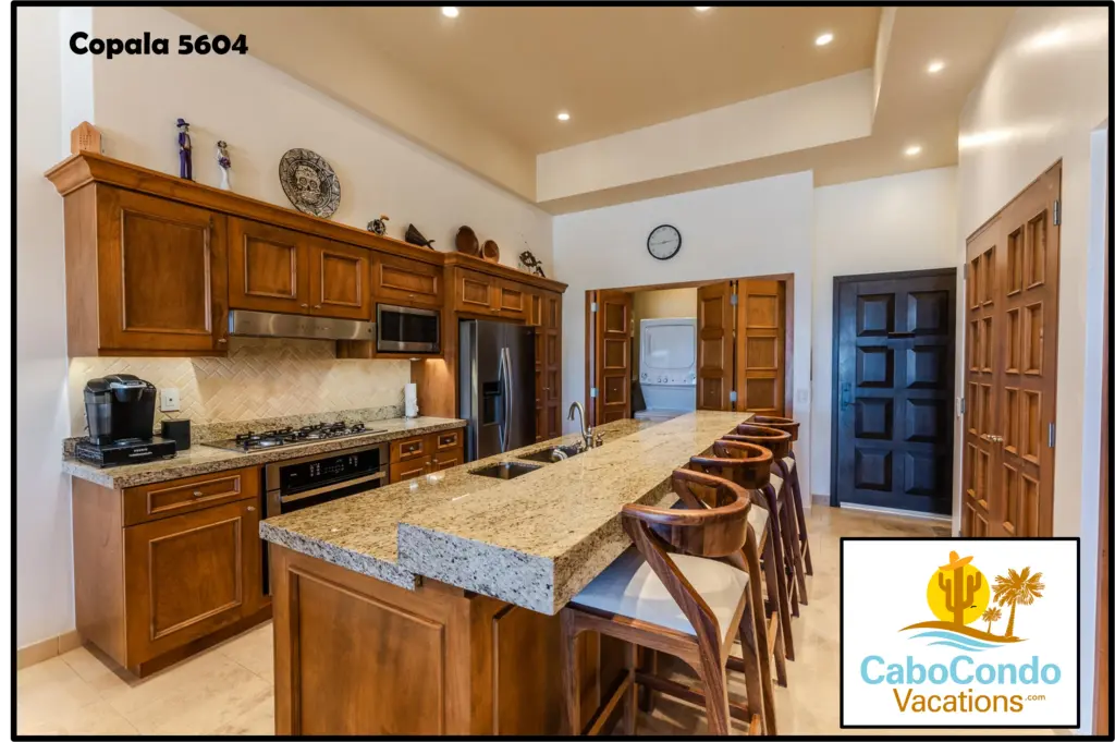 -Fully appointed kitchen with granite countertops and stainless steel appliances, including a drip coffee maker. Anything you need to cook an amazing meal, or, if cooking isn’t your thing, we can help arrange meals or you can dine at one of the resorts.
